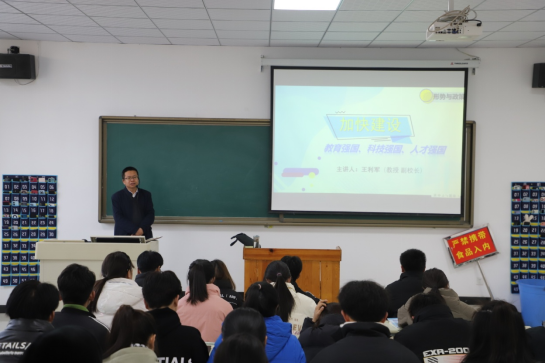 讲到着眼长远发展的重大抉择问题,王利军指出,教育是民族振兴、社会进步的重要基石,是功在当代、利在千秋的德政工程,教育在现代化建设中具有基础性、先导性、全局性作用;科技是国家强盛之基、安全之要,必须加快科技自立自强,走好科技创新这步先手棋;人才是实现民族振兴、赢得竞争主动的战略资源,必须坚持人才引领驱动。讲到铸就强国建设的坚实基础时,他以一系列准确的数据说明了我国教育普及水平实现了历史性跨越,同时对甘肃省和全国数据做了详细对比,充分阐述了教育对人才的支撑作用。并寄语同学们,学好专业技能,勇担民族复兴大任。