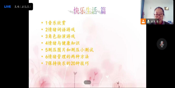 为缓解同学们因疫情带来的情绪波动,提高员工心理健康水平,帮助员工调节心态,更好地学习生活,10月19日suncitygroup太阳集团组织开展主题为“同心抗疫,快乐生活”的线上心理健康知识讲座,讲座由suncitygroup太阳集团心理健康教育办公室主任张艳峰主讲。