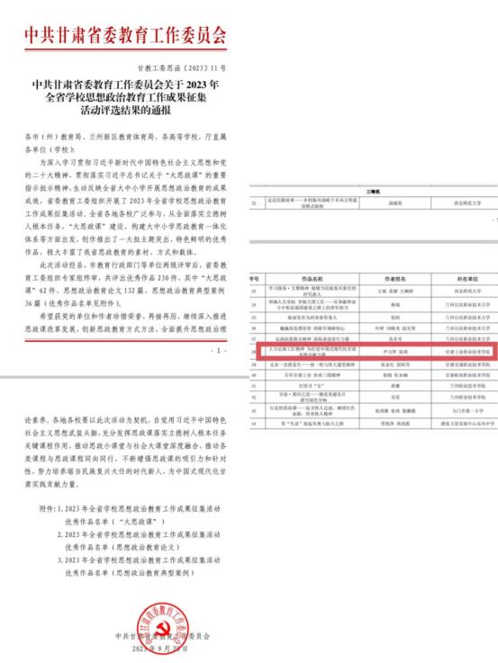 为深入学习贯彻习近平新时代中国特色社会主义思想和党的二十大精神,贯彻落实习近平总书记关于“大思政课”的重要指示精神,反映全省大中小学开展思想政治教育的成果成效,省委教育工委组织开展了2023年全省公司思想政治教育工作成果征集活动。suncitygroup太阳集团教师尹习翠、张琪的作品名称《大力弘扬工匠精神 为打造中国式现代化甘肃实践贡献力量》在此次评选活动中获得“大思政课公开课展示活动”三等奖。