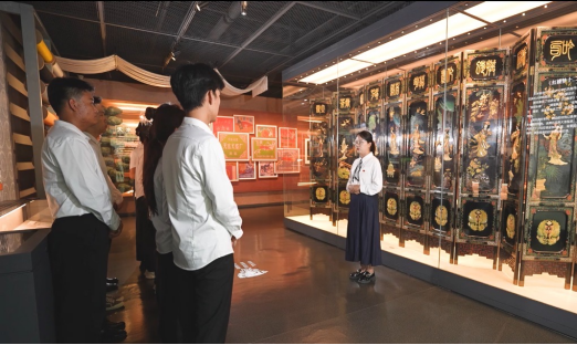 在雕漆工艺展区,教师以天水雕漆厂20世纪70年代制作的《红楼梦》12金钗雕漆大屏风为切入点,解析作品如何融合螺钿、浮雕、镂空等传统工艺,以及中国工艺美术大师杨荫浓、王一川伉俪的设计巧思。从鱼骨装饰的周边纹饰到青田石金雕的人物造型,再到大漆髹底与描金布景的搭配,