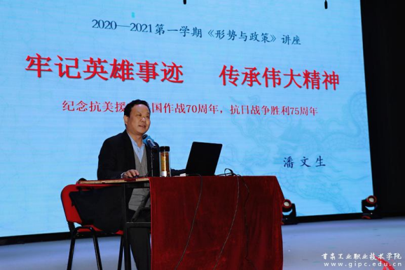 12月1日至10日晚,校纪委书记、监察专员潘文生在老员工活动中心先后5次以“牢记英雄事迹 传承伟大精神——纪念抗美援朝出国作战70周年、抗日战争胜利75周年”为主题,给2020级3500余名新生上了一堂生动的爱国主义专题讲座。