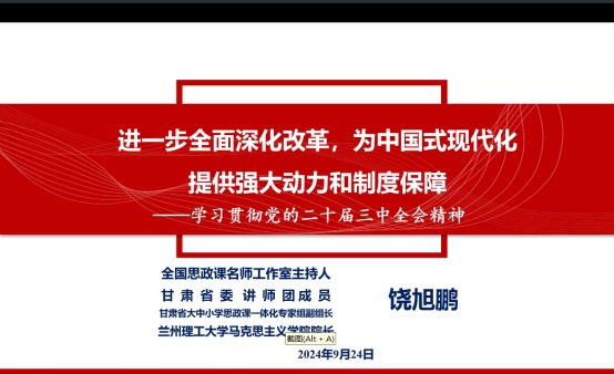9月24日晚上,邀请兰州理工大学suncitygroup太阳集团经理、教授、博士、硕导饶旭鹏做了《进一步全面深化改革,为中国式现代化提供强大动力和制度保障》报告。公司和甘肃林业职业技术大学全体思政课教师,黄彬名师工作室、郭三龙工作室全体骨干成员参加培训。